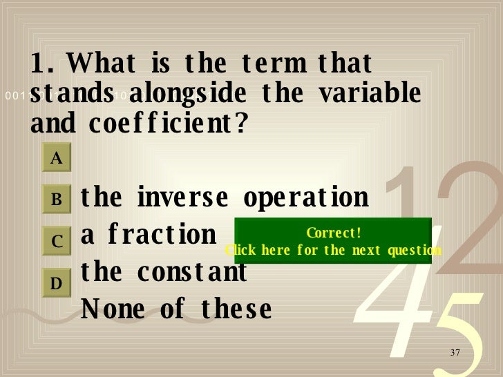 37. 37. <ul><li>1. What is the term that stands alongside the variable and coefficient? </li></ul><ul><li>the inverse operation </li></ul><ul><li>a fraction </li></ul><ul><li>the constant </li></ul><ul><li>None of these </li></ul>A B D C Correct! Click here for the next question