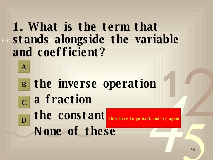 38. 38. <ul><li>1. What is the term that stands alongside the variable and coefficient? </li></ul><ul><li>the inverse operation </li></ul><ul><li>a fraction </li></ul><ul><li>the constant </li></ul><ul><li>None of these </li></ul>A B D C Click here to go back and try again