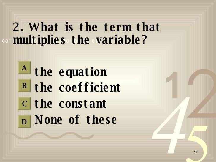 39. 39. <ul><li>2. What is the term that multiplies the variable? </li></ul><ul><li>the equation </li></ul><ul><li>the coefficient </li></ul><ul><li>the constant </li></ul><ul><li>None of these </li></ul>A B D C
