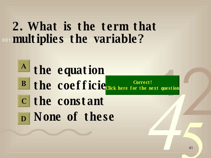 41. 41. <ul><li>2. What is the term that multiplies the variable? </li></ul><ul><li>the equation </li></ul><ul><li>the coefficient </li></ul><ul><li>the constant </li></ul><ul><li>None of these </li></ul>A B D C Correct! Click here for the next question