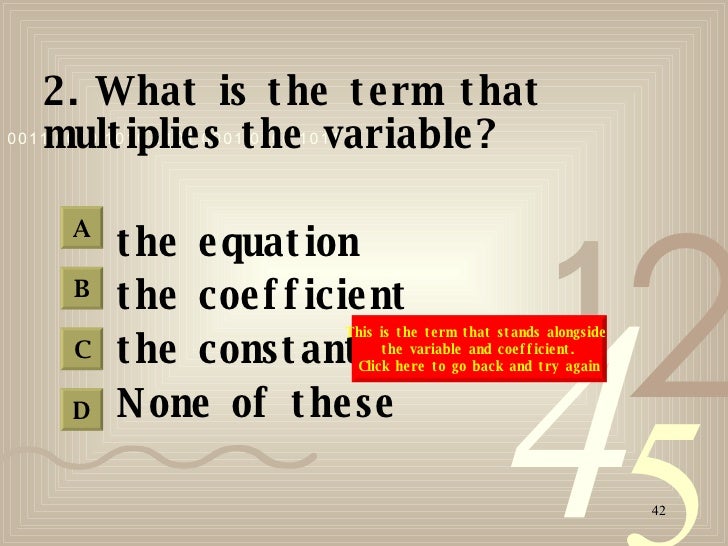 42. 42. <ul><li>2. What is the term that multiplies the variable? </li></ul><ul><li>the equation </li></ul><ul><li>the coefficient </li></ul><ul><li>the constant </li></ul><ul><li>None of these </li></ul>A B D C This is the term that stands alongside the variable and coefficient. Click here to go back and try again