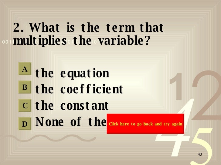 43. 43. <ul><li>2. What is the term that multiplies the variable? </li></ul><ul><li>the equation </li></ul><ul><li>the coefficient </li></ul><ul><li>the constant </li></ul><ul><li>None of these </li></ul>A B D C Click here to go back and try again
