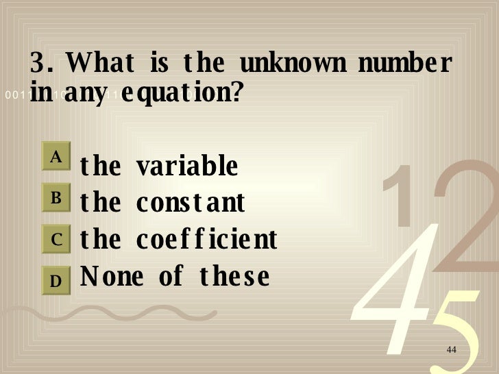 44. 44. <ul><li>3. What is the unknown number in any equation? </li></ul><ul><li>the variable </li></ul><ul><li>the constant </li></ul><ul><li>the coefficient </li></ul><ul><li>None of these </li></ul>A B D C
