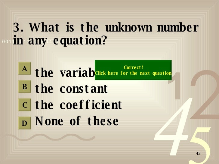 45. 45. <ul><li>3. What is the unknown number in any equation? </li></ul><ul><li>the variable </li></ul><ul><li>the constant </li></ul><ul><li>the coefficient </li></ul><ul><li>None of these </li></ul>A B D C Correct! Click here for the next question