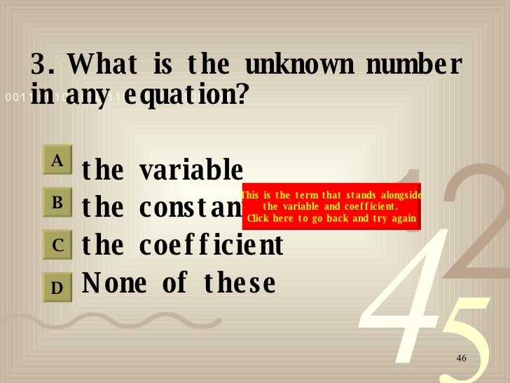 46. 46. <ul><li>3. What is the unknown number in any equation? </li></ul><ul><li>the variable </li></ul><ul><li>the constant </li></ul><ul><li>the coefficient </li></ul><ul><li>None of these </li></ul>A B D C This is the term that stands alongside the variable and coefficient. Click here to go back and try again