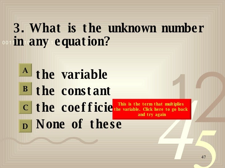 47. 47. <ul><li>3. What is the unknown number in any equation? </li></ul><ul><li>the variable </li></ul><ul><li>the constant </li></ul><ul><li>the coefficient </li></ul><ul><li>None of these </li></ul>A B D C This is the term that multiplies the variable. Click here to go back and try again