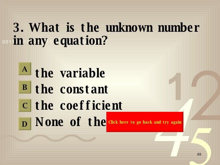 48. 48. <ul><li>3. What is the unknown number in any equation? </li></ul><ul><li>the variable </li></ul><ul><li>the constant </li></ul><ul><li>the coefficient </li></ul><ul><li>None of these </li></ul>A B D C Click here to go back and try again