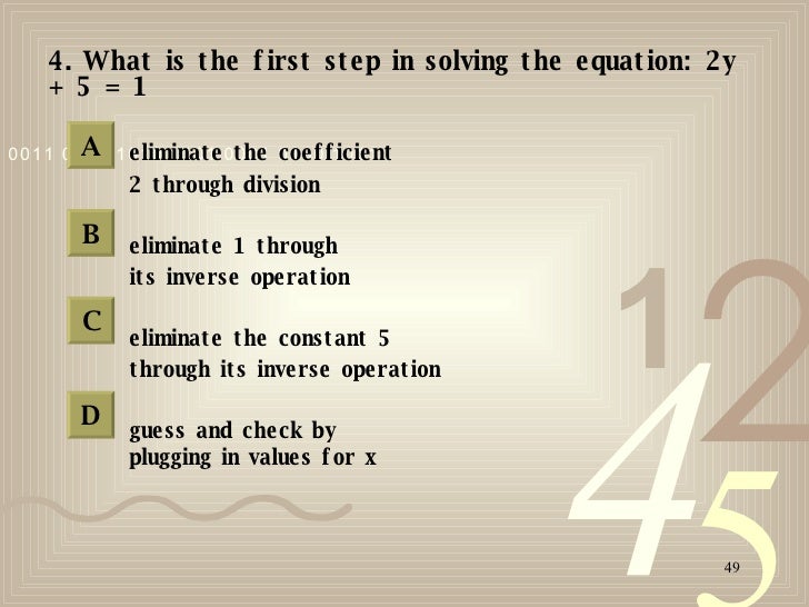 49. 49. <ul><li>4. What is the first step in solving the equation: 2y + 5 = 1 </li></ul><ul><li>eliminate the coefficient </li></ul><ul><li>2 through division </li></ul><ul><li>eliminate 1 through </li></ul><ul><li>its inverse operation </li></ul><ul><li>eliminate the constant 5 </li></ul><ul><li>through its inverse operation </li></ul><ul><li>guess and check by </li></ul><ul><li>plugging in values for x </li></ul>A B D C