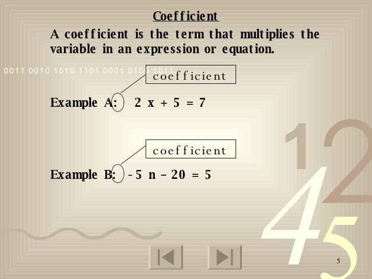 5. 5. <ul><li>Coefficient </li></ul><ul><li>A coefficient is the term that multiplies the variable in an expression or equation. </li></ul><ul><li>Example A: 2 x + 5 = 7 </li></ul><ul><li>Example B: -5 n – 20 = 5 </li></ul>coefficient coefficient