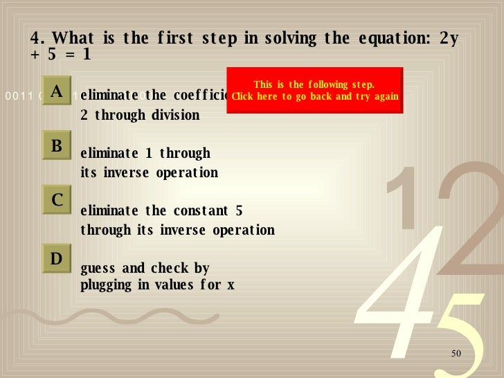50. 50. <ul><li>4. What is the first step in solving the equation: 2y + 5 = 1 </li></ul><ul><li>eliminate the coefficient </li></ul><ul><li>2 through division </li></ul><ul><li>eliminate 1 through </li></ul><ul><li>its inverse operation </li></ul><ul><li>eliminate the constant 5 </li></ul><ul><li>through its inverse operation </li></ul><ul><li>guess and check by </li></ul><ul><li>plugging in values for x </li></ul>A B D C This is the following step. Click here to go back and try again