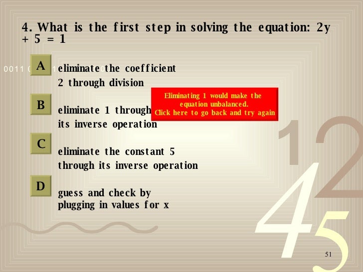 51. 51. <ul><li>4. What is the first step in solving the equation: 2y + 5 = 1 </li></ul><ul><li>eliminate the coefficient </li></ul><ul><li>2 through division </li></ul><ul><li>eliminate 1 through </li></ul><ul><li>its inverse operation </li></ul><ul><li>eliminate the constant 5 </li></ul><ul><li>through its inverse operation </li></ul><ul><li>guess and check by </li></ul><ul><li>plugging in values for x </li></ul>A B D C Eliminating 1 would make the equation unbalanced. Click here to go back and try again