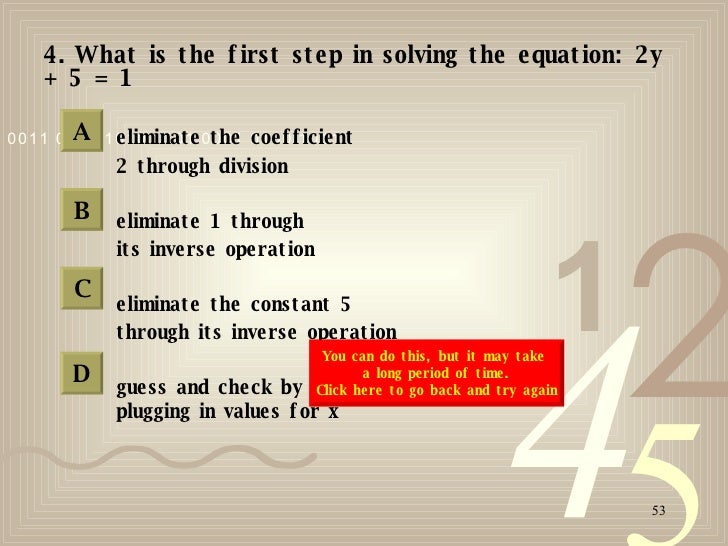 53. 53. <ul><li>4. What is the first step in solving the equation: 2y + 5 = 1 </li></ul><ul><li>eliminate the coefficient </li></ul><ul><li>2 through division </li></ul><ul><li>eliminate 1 through </li></ul><ul><li>its inverse operation </li></ul><ul><li>eliminate the constant 5 </li></ul><ul><li>through its inverse operation </li></ul><ul><li>guess and check by </li></ul><ul><li>plugging in values for x </li></ul>A B D C You can do this, but it may take a long period of time. Click here to go back and try again