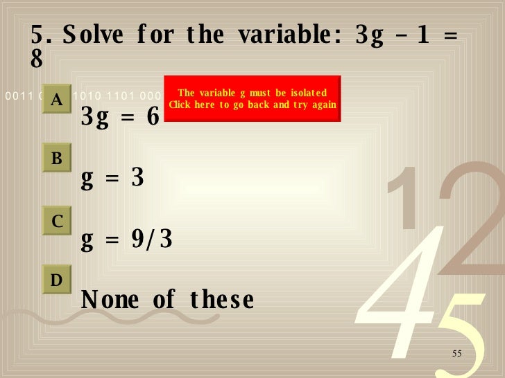 55. 55. <ul><li>5. Solve for the variable: 3g – 1 = 8 </li></ul><ul><li>3g = 6 </li></ul><ul><li>g = 3 </li></ul><ul><li>g = 9/3 </li></ul><ul><li>None of these </li></ul>A B D C The variable g must be isolated Click here to go back and try again