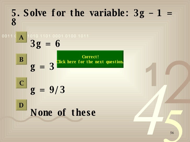 56. 56. <ul><li>5. Solve for the variable: 3g – 1 = 8 </li></ul><ul><li>3g = 6 </li></ul><ul><li>g = 3 </li></ul><ul><li>g = 9/3 </li></ul><ul><li>None of these </li></ul>A B D C Correct! Click here for the next question.