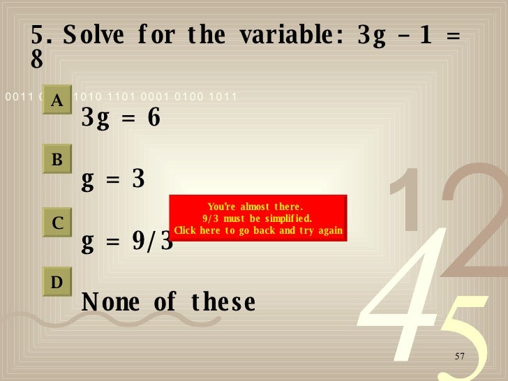 57. 57. <ul><li>5. Solve for the variable: 3g – 1 = 8 </li></ul><ul><li>3g = 6 </li></ul><ul><li>g = 3 </li></ul><ul><li>g = 9/3 </li></ul><ul><li>None of these </li></ul>A B D C You’re almost there. 9/3 must be simplified. Click here to go back and try again