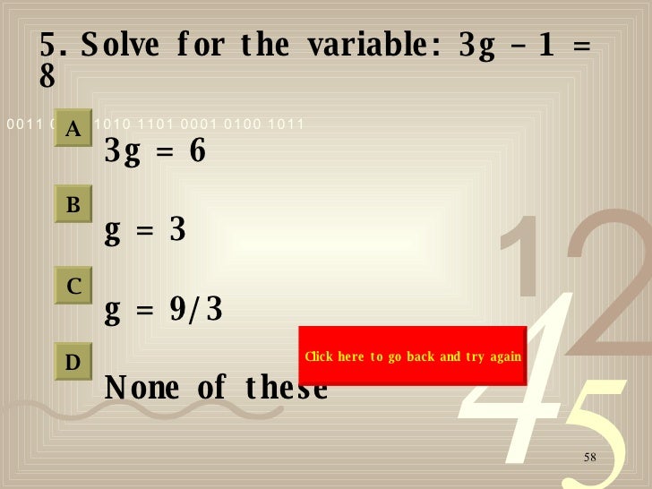58. 58. <ul><li>5. Solve for the variable: 3g – 1 = 8 </li></ul><ul><li>3g = 6 </li></ul><ul><li>g = 3 </li></ul><ul><li>g = 9/3 </li></ul><ul><li>None of these </li></ul>A B D C Click here to go back and try again