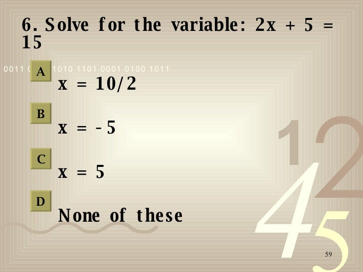 59. 59. <ul><li>6. Solve for the variable: 2x + 5 = 15 </li></ul><ul><li>x = 10/2 </li></ul><ul><li>x = -5 </li></ul><ul><li>x = 5 </li></ul><ul><li>None of these </li></ul>A B D C
