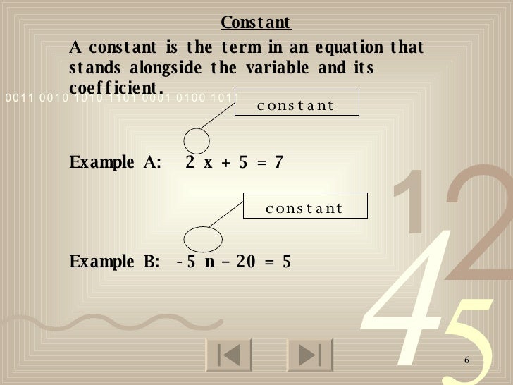 6. 6. <ul><li>Constant </li></ul><ul><li>A constant is the term in an equation that stands alongside the variable and its coefficient. </li></ul><ul><li>Example A: 2 x + 5 = 7 </li></ul><ul><li>Example B: -5 n – 20 = 5 </li></ul>constant constant