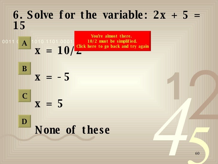 60. 60. <ul><li>6. Solve for the variable: 2x + 5 = 15 </li></ul><ul><li>x = 10/2 </li></ul><ul><li>x = -5 </li></ul><ul><li>x = 5 </li></ul><ul><li>None of these </li></ul>A B D C You’re almost there. 10/2 must be simplified. Click here to go back and try again