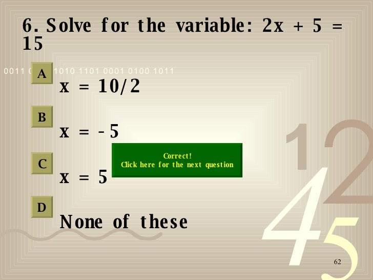 62. 62. <ul><li>6. Solve for the variable: 2x + 5 = 15 </li></ul><ul><li>x = 10/2 </li></ul><ul><li>x = -5 </li></ul><ul><li>x = 5 </li></ul><ul><li>None of these </li></ul>A B D C Correct! Click here for the next question