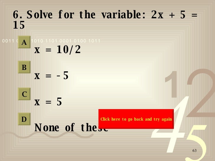 63. 63. <ul><li>6. Solve for the variable: 2x + 5 = 15 </li></ul><ul><li>x = 10/2 </li></ul><ul><li>x = -5 </li></ul><ul><li>x = 5 </li></ul><ul><li>None of these </li></ul>A B D C Click here to go back and try again