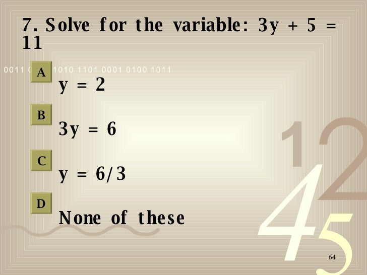 64. 64. <ul><li>7. Solve for the variable: 3y + 5 = 11 </li></ul><ul><li>y = 2 </li></ul><ul><li>3y = 6 </li></ul><ul><li>y = 6/3 </li></ul><ul><li>None of these </li></ul>A B D C