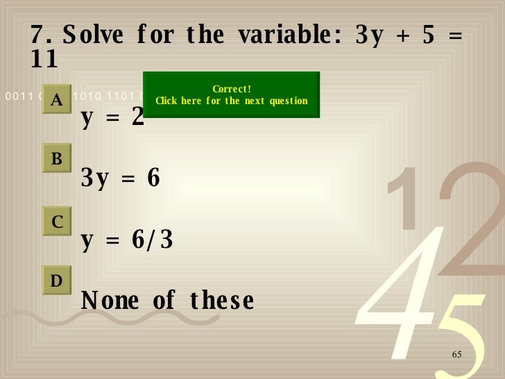 65. 65. <ul><li>7. Solve for the variable: 3y + 5 = 11 </li></ul><ul><li>y = 2 </li></ul><ul><li>3y = 6 </li></ul><ul><li>y = 6/3 </li></ul><ul><li>None of these </li></ul>A B D C Correct! Click here for the next question