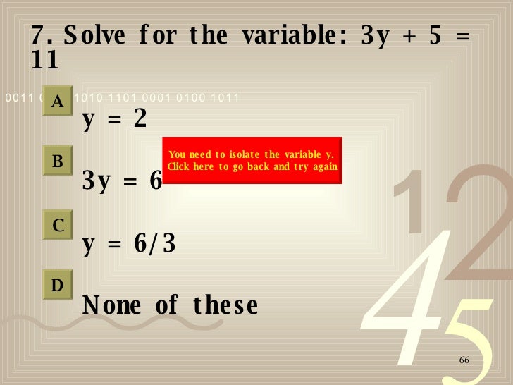 66. 66. <ul><li>7. Solve for the variable: 3y + 5 = 11 </li></ul><ul><li>y = 2 </li></ul><ul><li>3y = 6 </li></ul><ul><li>y = 6/3 </li></ul><ul><li>None of these </li></ul>A B D C You need to isolate the variable y. Click here to go back and try again