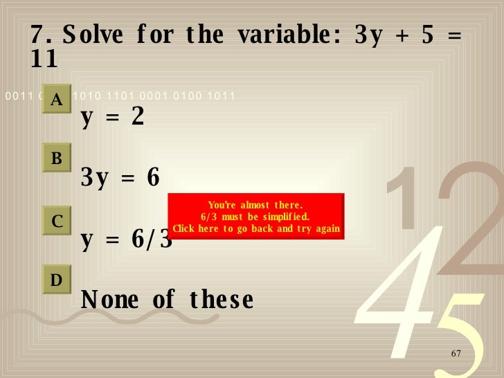 67. 67. <ul><li>7. Solve for the variable: 3y + 5 = 11 </li></ul><ul><li>y = 2 </li></ul><ul><li>3y = 6 </li></ul><ul><li>y = 6/3 </li></ul><ul><li>None of these </li></ul>A B D C You’re almost there. 6/3 must be simplified. Click here to go back and try again