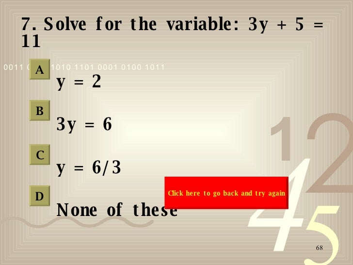 68. 68. <ul><li>7. Solve for the variable: 3y + 5 = 11 </li></ul><ul><li>y = 2 </li></ul><ul><li>3y = 6 </li></ul><ul><li>y = 6/3 </li></ul><ul><li>None of these </li></ul>A B D C Click here to go back and try again