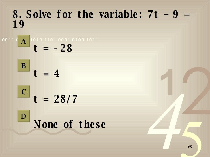 69. 69. <ul><li>8. Solve for the variable: 7t – 9 = 19 </li></ul><ul><li>t = -28 </li></ul><ul><li>t = 4 </li></ul><ul><li>t = 28/7 </li></ul><ul><li>None of these </li></ul>A B D C