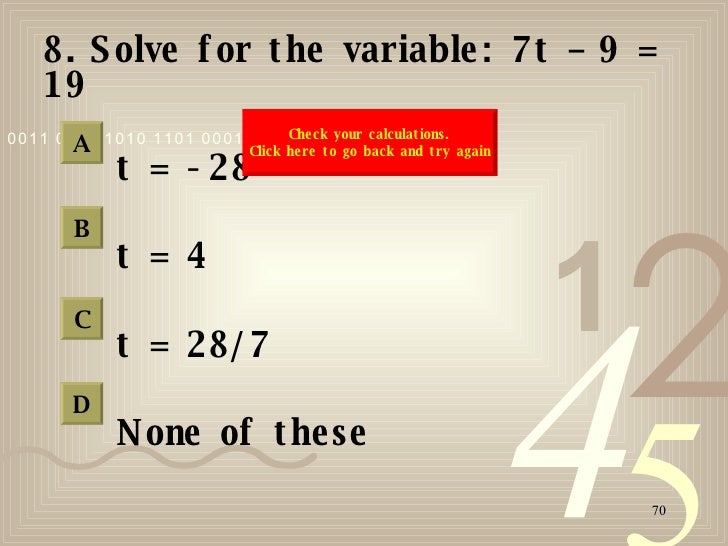 70. 70. <ul><li>8. Solve for the variable: 7t – 9 = 19 </li></ul><ul><li>t = -28 </li></ul><ul><li>t = 4 </li></ul><ul><li>t = 28/7 </li></ul><ul><li>None of these </li></ul>A B D C Check your calculations. Click here to go back and try again