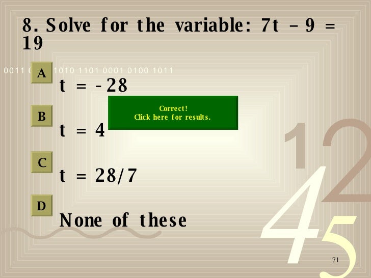 71. 71. <ul><li>8. Solve for the variable: 7t – 9 = 19 </li></ul><ul><li>t = -28 </li></ul><ul><li>t = 4 </li></ul><ul><li>t = 28/7 </li></ul><ul><li>None of these </li></ul>A B D C Correct! Click here for results.