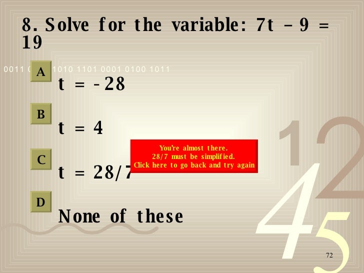 72. 72. <ul><li>8. Solve for the variable: 7t – 9 = 19 </li></ul><ul><li>t = -28 </li></ul><ul><li>t = 4 </li></ul><ul><li>t = 28/7 </li></ul><ul><li>None of these </li></ul>A B D C You’re almost there. 28/7 must be simplified. Click here to go back and try again