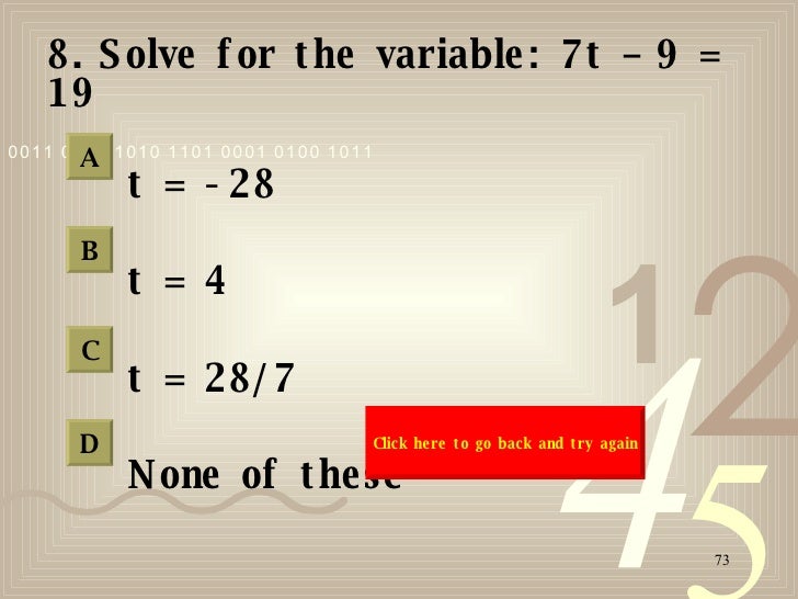 73. 73. <ul><li>8. Solve for the variable: 7t – 9 = 19 </li></ul><ul><li>t = -28 </li></ul><ul><li>t = 4 </li></ul><ul><li>t = 28/7 </li></ul><ul><li>None of these </li></ul>A B D C Click here to go back and try again
