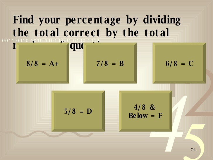74. 74. <ul><li>Find your percentage by dividing the total correct by the total number of questions. </li></ul>8/8 = A+ 6/8 = C 5/8 = D 7/8 = B 4/8 & Below = F