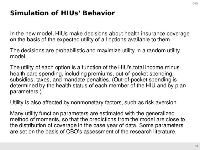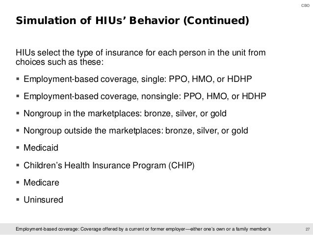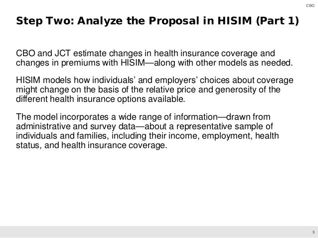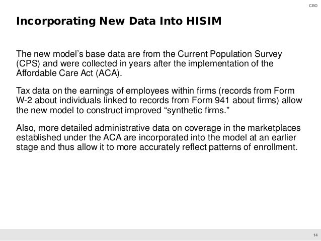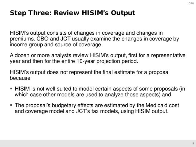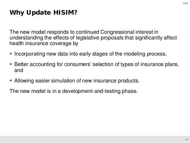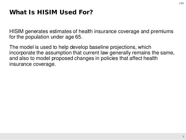 HISIM generates estimates of health insurance coverage and premiums for the U.S. population under age 65. CBO’s analysts use that model to develop baseline projections and to simulate the effects of proposed changes to policies involving health insurance coverage.