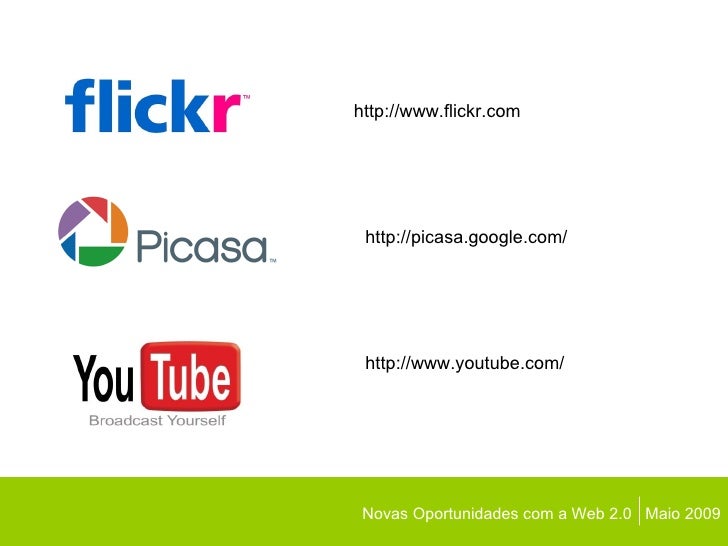 10. 11. Novas Oportunidades com a Web 2.0 Maio 2009 http://www.flickr.com http://picasa.google.com/ http://www.youtube.com/