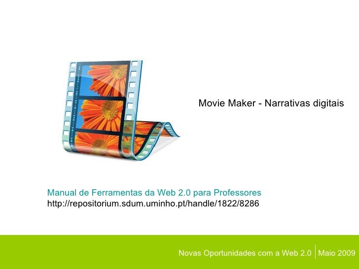 11. 12. Novas Oportunidades com a Web 2.0 Maio 2009 Manual de Ferramentas da Web 2.0 para Professores http://repositorium.sdum.uminho.pt/handle/1822/8286 Movie Maker - Narrativas digitais