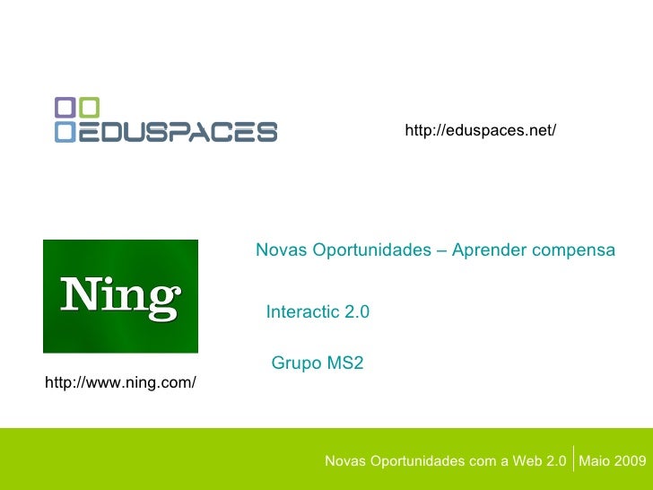 12. 13. Novas Oportunidades com a Web 2.0 Maio 2009 http://www.ning.com/ http://eduspaces.net/ Novas Oportunidades – Aprender compensa Interactic 2.0 Grupo MS2