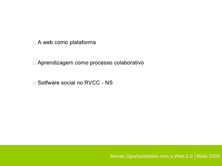 Novas Oportunidades com a Web 2.0  Maio 2009 □   A web como plataforma □   Aprendizagem como processo colaborativo □   Sot...