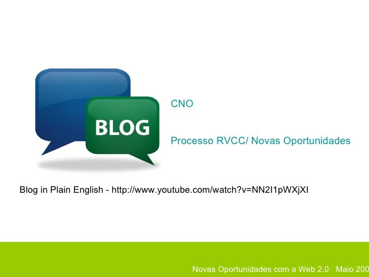 8. 8. Novas Oportunidades com a Web 2.0 Maio 2009 CNO Processo RVCC/ Novas Oportunidades Novas Oportunidades com a Web 2.0 Maio 2009 Blog in Plain English - http://www.youtube.com/watch?v=NN2I1pWXjXI