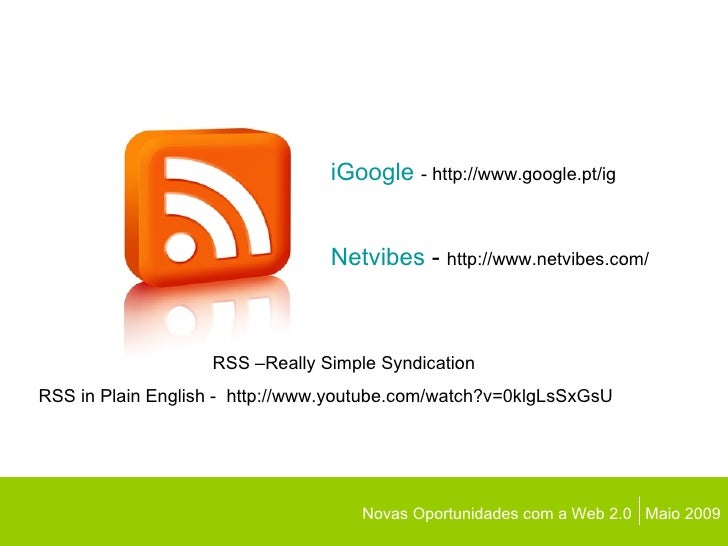 9. 9. Novas Oportunidades com a Web 2.0 Maio 2009 iGoogle - http://www.google.pt/ig Netvibes - http://www.netvibes.com/ RSS –Really Simple Syndication RSS in Plain English - http://www.youtube.com/watch?v=0klgLsSxGsU
