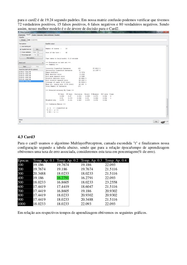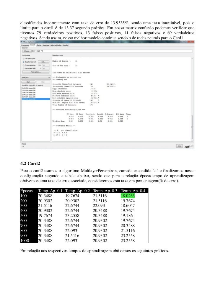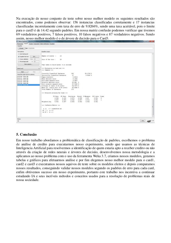 Este artigo pretende criar modelos de redes neurais e árvores de decisão para problemas reais de nossa sociedade, neste caso usaremos o problema que aborda a análise de credito, problemática relacionada a operadoras de cartões de credito e outras instituições financeiras, os respectivos arquivos usados serão: card1, card2 e card3, da coleção de dados reais Proben1, o simulador usado será o Weka 3.7.