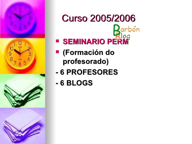 2. 2. Curso 2005/2006 <ul><li>SEMINARIO PERMANENTE </li></ul><ul><li>(Formación do profesorado) </li></ul><ul><li>- 6 PROFESORES </li></ul><ul><li>- 6 BLOGS </li></ul>
