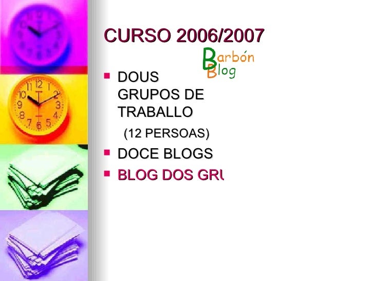 4. 4. CURSO 2006/2007 <ul><li>DOUS GRUPOS DE TRABALLO </li></ul><ul><li>(12 PERSOAS) </li></ul><ul><li>DOCE BLOGS </li></ul><ul><li>BLOG DOS GRUPOS DE TRABALLO </li></ul>