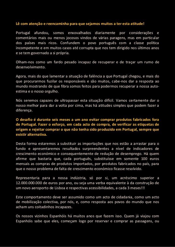 2. 2. Lê com atenção e reencaminha para que sejamos muitos a ter esta atitude!Portugal afundou, somos enxovalhados diariamente por considerações ecomentários mais ou menos jocosos vindos de várias paragens, mas em particulardos países mais ricos. Confundem o povo português com a classe políticaincompetente e em muitos casos até corrupta que nos tem dirigido nos últimos anose se tem governado a si própria.Olham-nos como um fardo pesado incapaz de recuperar e de traçar um rumo dedesenvolvimento.Agora, mais do que lamentar a situação de falência a que Portugal chegou, e mais doque procurarmos fuzilar os responsáveis e são muitos, cabe-nos dar a resposta aomundo mostrando de que fibra somos feitos para podermos recuperar a nossa auto-estima e o nosso orgulho.Nós seremos capazes de ultrapassar esta situação difícil. Vamos certamente dar onosso melhor para dar a volta por cima, mas há atitudes simples que podem fazer adiferença.O desafio é durante seis meses a um ano evitar comprar produtos fabricados forade Portugal. Fazer o esforço, em cada acto de compra, de verificar as etiquetas deorigem e rejeitar comprar o que não tenha sido produzido em Portugal, sempre queexistir alternativa.Desta forma estaremos a substituir as importações que nos estão a arrastar para ofundo e apresentaremos resultados surpreendentes a nível de indicadores decrescimento económico e consequentemente de redução de desemprego. Há quemafirme que bastaria que, cada português, substituísse em somente 100 eurosmensais as compras de produtos importados, por produtos fabricados no país, paraque o nosso problema de falta de crescimento económico ficasse resolvido.Representaria para a nossa indústria, só por si, um acréscimo superior a12.000.000.000 de euros por ano, ou seja uma verba equivalente à da construção deum novo aeroporto de Lisboa e respectivas acessibilidades, a cada 3 meses!!!Este comportamento deve ser assumido como um acto de cidadania, como um actode mobilização colectiva, por nós, e, como resposta aos povos do mundo que nosacham uns coitadinhos incapazes.Os nossos vizinhos Espanhóis há muitos anos que fazem isso. Quem já viajou comEspanhóis sabe que eles, começam logo por reservar e comprar as passagens, ou