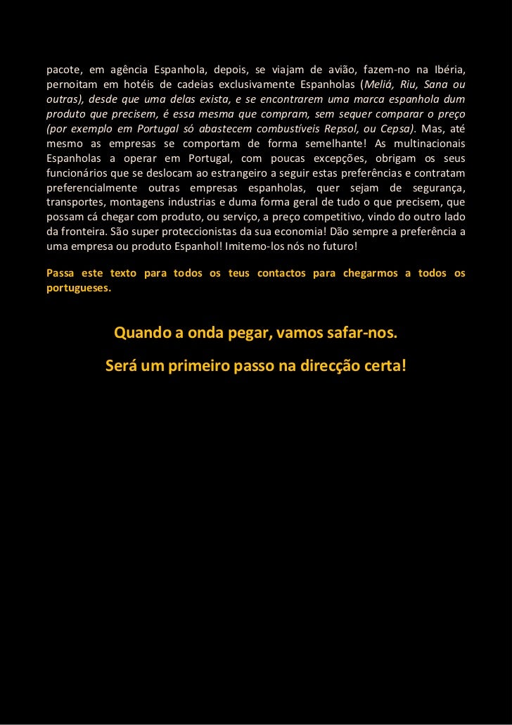 3. 3. pacote, em agência Espanhola, depois, se viajam de avião, fazem-no na Ibéria,pernoitam em hotéis de cadeias exclusivamente Espanholas (Meliá, Riu, Sana ououtras), desde que uma delas exista, e se encontrarem uma marca espanhola dumproduto que precisem, é essa mesma que compram, sem sequer comparar o preço(por exemplo em Portugal só abastecem combustíveis Repsol, ou Cepsa). Mas, atémesmo as empresas se comportam de forma semelhante! As multinacionaisEspanholas a operar em Portugal, com poucas excepções, obrigam os seusfuncionários que se deslocam ao estrangeiro a seguir estas preferências e contratampreferencialmente outras empresas espanholas, quer sejam de segurança,transportes, montagens industrias e duma forma geral de tudo o que precisem, quepossam cá chegar com produto, ou serviço, a preço competitivo, vindo do outro ladoda fronteira. São super proteccionistas da sua economia! Dão sempre a preferência auma empresa ou produto Espanhol! Imitemo-los nós no futuro!Passa este texto para todos os teus contactos para chegarmos a todos osportugueses. Quando a onda pegar, vamos safar-nos. Será um primeiro passo na direcção certa!