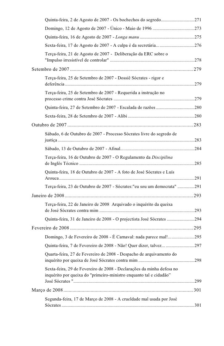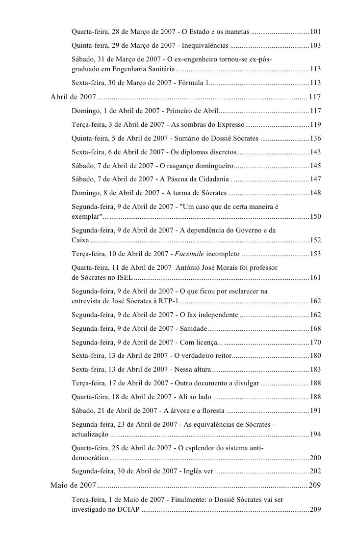 6. 6. Quarta-feira, 2 de Maio de 2007 - O controlo superior ....................................... 211 Quinta-feira, 3 de Maio de 2007 - Mas perfeito, perfeito... ................................. 214 Sexta-feira, 4 de Maio de 2007 - A ciência da engenharia .................................. 217 Sábado, 5 de Maio de 2007 - A certidão de cidadania ......................................... 223 Terça-feira, 8 de Maio de 2007 - A inspectora e o aluno n.º 950389 .................. 226 Quinta-feira, 10 de Maio de 2007 - "Profissão: Engº Civil" ................................ 227 Sexta-feira, 11 de Maio de 2007 - Sócrates e o ISEL .......................................... 231 Segunda-feira, 14 de Maio de 2007 -Profissão: engenheiro, perdão, licenciado... .......................................................................................................... 232 Quarta-feira, 16 de Maio de 2007 - Nada a responder... ...................................... 233 Sexta-feira, 18 de Maio de 2007 - Wolfowitz versus Sócrates ............................ 235 Sábado, 19 de Maio de 2007 - Farinha do mesmo saco ....................................... 236 Quarta-feira, 30 de Maio de 2007 - O Dossiê no DCIAP .................................... 238 Quinta-feira, 31 de Maio de 2007 - O recibo e a factura ..................................... 238 Junho de 2007..................................................................................................... 241 Quarta-feira, 6 de Junho de 2007 - O Estado socrático e o comprimento dos prazos ...................................................................................... 241 Sexta-feira, 15 de Junho de 2007 - SMS e bufaria do poder engenheireiral ...................................................................................................... 243 Sexta-feira, 15 de Junho de 2007 - Arguido por causa... do Dossiê Sócrates ............................................................................................................... 246 Quarta-feira, 20 de Junho de 2007 - Desta vez .................................................... 247 Segunda-feira, 25 de Junho de 2007 - Beira da cova ........................................... 252 Quinta-feira, 28 de Junho de 2007 - Portugal ...................................................... 254 Sexta-feira, 29 de Junho de 2007 - Queixa do "primeiro-ministro enquanto tal e cidadão"... ..................................................................................... 254 Julho de 2007 ..................................................................................................... 257 Terça-feira, 3 de Julho de 2007 - O sal e a pimenta ............................................ 257 Quinta-feira, 5 de Julho de 2007 - Não tenhamos vergonha... ............................. 257 Segunda-feira, 9 de Julho de 2007 - Negro antes de verde .................................. 259 Quinta-feira, 12 de Julho de 2007 - Cuidadinho .................................................. 260 Quarta-feira, 18 de Julho de 2007 - "Apresentou" ............................................... 260 Quarta-feira, 25 de Julho de 2007 - Airborne ...................................................... 262 Quarta-feira, 25 de Julho de 2007 - Manera ........................................................ 263 Sábado, 28 de Julho de 2007 Os outros .............................................................. 264 Agosto de 2007................................................................................................... 265 Quarta-feira, 1 de Agosto de 2007 - Arquive-se! ................................................ 265