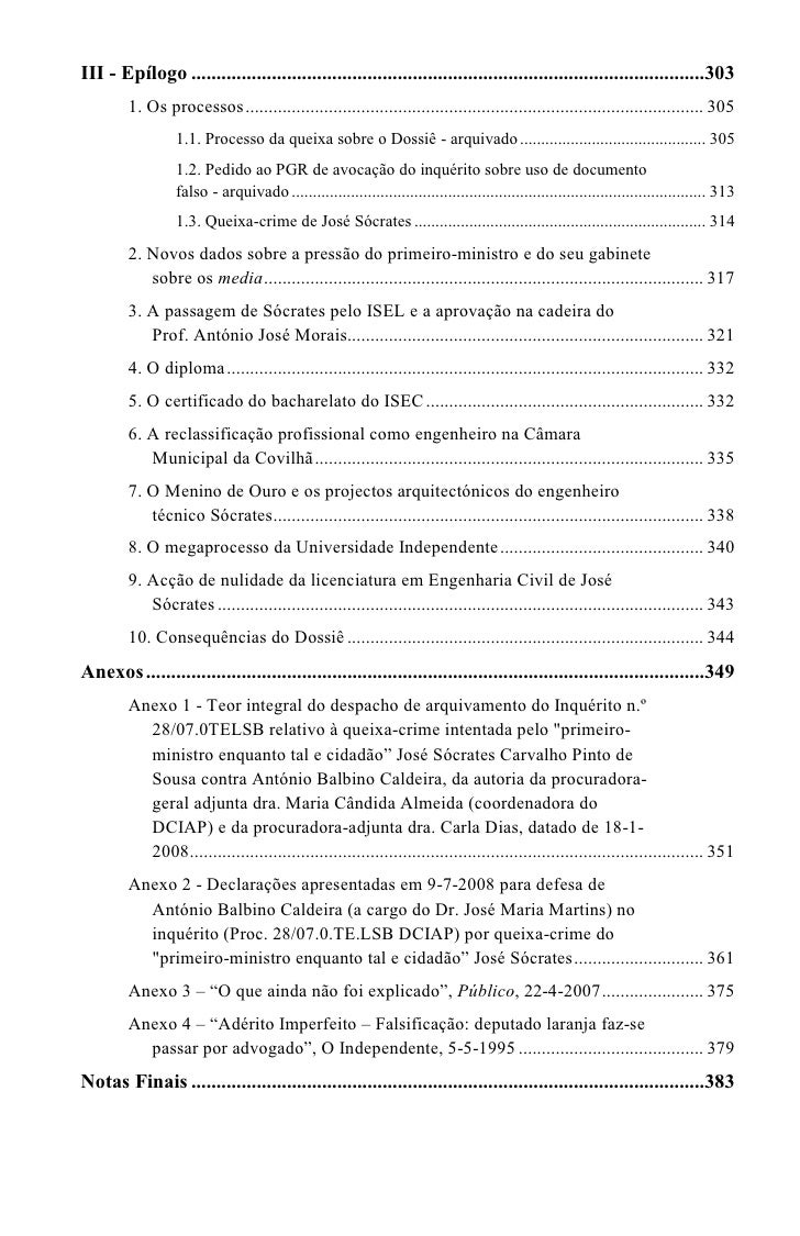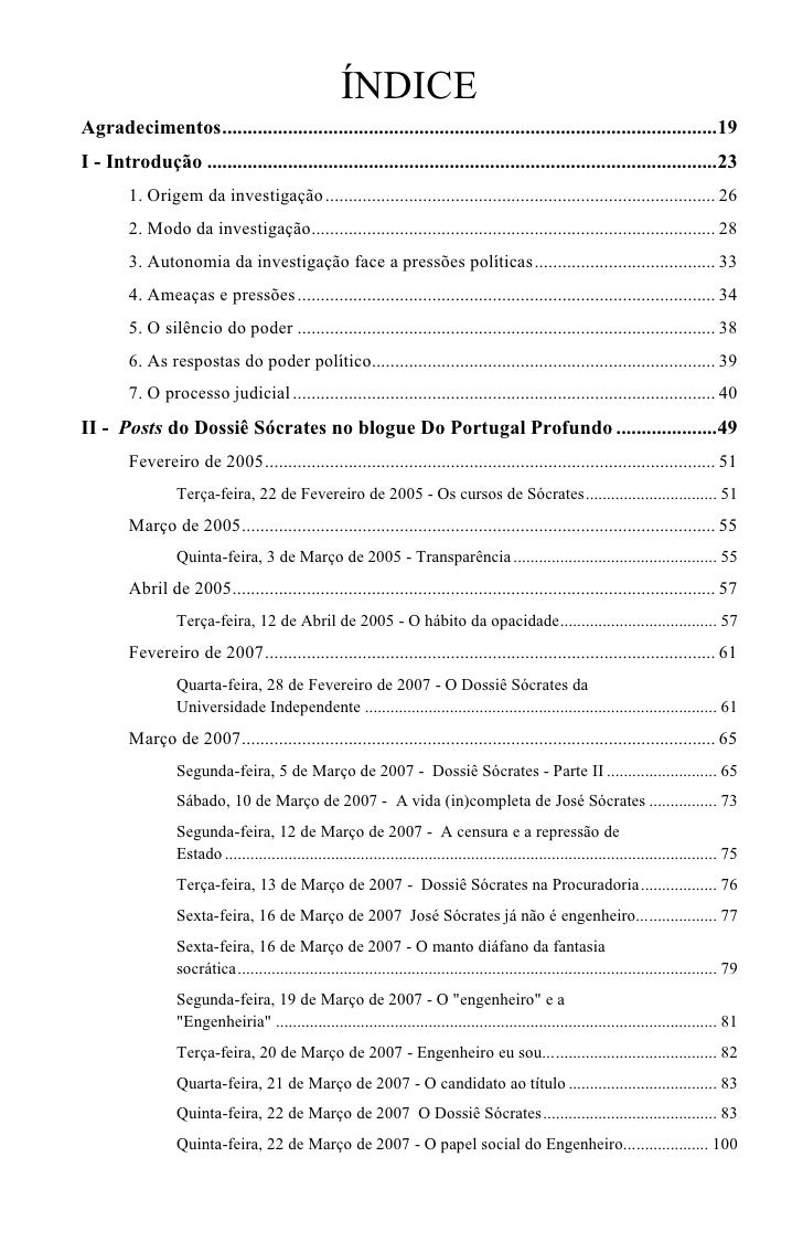 4. 4. ÍNDICE Agradecimentos ..................................................................................................19 I - Introdução .....................................................................................................23 1. Origem da investigação .................................................................................... 26 2. Modo da investigação....................................................................................... 28 3. Autonomia da investigação face a pressões políticas ....................................... 33 4. Ameaças e pressões .......................................................................................... 34 5. O silêncio do poder .......................................................................................... 38 6. As respostas do poder político.......................................................................... 39 7. O processo judicial ........................................................................................... 40 II - Posts do Dossiê Sócrates no blogue Do Portugal Profundo ....................49 Fevereiro de 2005 ................................................................................................. 51 Terça-feira, 22 de Fevereiro de 2005 - Os cursos de Sócrates ............................... 51 Março de 2005...................................................................................................... 55 Quinta-feira, 3 de Março de 2005 - Transparência ................................................ 55 Abril de 2005........................................................................................................ 57 Terça-feira, 12 de Abril de 2005 - O hábito da opacidade ..................................... 57 Fevereiro de 2007 ................................................................................................. 61 Quarta-feira, 28 de Fevereiro de 2007 - O Dossiê Sócrates da Universidade Independente ................................................................................... 61 Março de 2007...................................................................................................... 65 Segunda-feira, 5 de Março de 2007 - Dossiê Sócrates - Parte II .......................... 65 Sábado, 10 de Março de 2007 - A vida (in)completa de José Sócrates ................ 73 Segunda-feira, 12 de Março de 2007 - A censura e a repressão de Estado .................................................................................................................... 75 Terça-feira, 13 de Março de 2007 - Dossiê Sócrates na Procuradoria .................. 76 Sexta-feira, 16 de Março de 2007 José Sócrates já não é engenheiro... ................ 77 Sexta-feira, 16 de Março de 2007 - O manto diáfano da fantasia socrática ................................................................................................................. 79 Segunda-feira, 19 de Março de 2007 - O "engenheiro" e a "Engenheiria" ........................................................................................................ 81 Terça-feira, 20 de Março de 2007 - Engenheiro eu sou... ...................................... 82 Quarta-feira, 21 de Março de 2007 - O candidato ao título ................................... 83 Quinta-feira, 22 de Março de 2007 O Dossiê Sócrates ......................................... 83 Quinta-feira, 22 de Março de 2007 - O papel social do Engenheiro... ................. 100